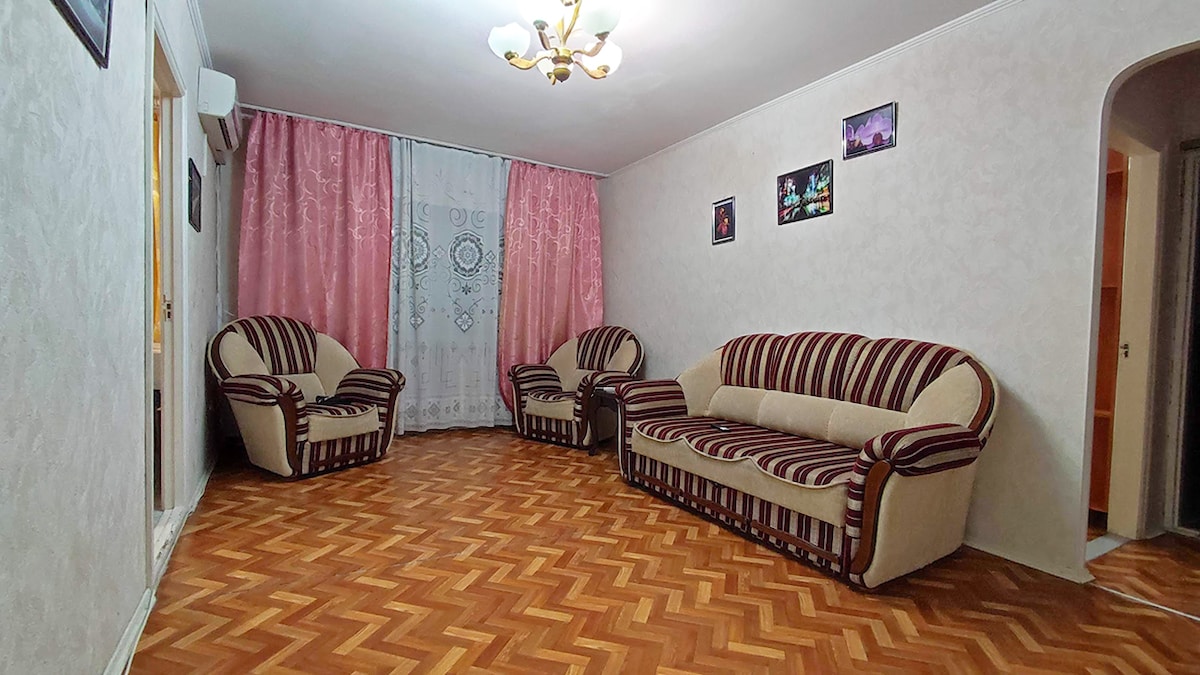 I invite everyone to visit the city of Tiraspol and take advantage of our accommodation. The apartment is located in close proximity to the city center (1-2 minutes walk). The apartment has everything for a comfortable stay. Comfortable bed and plasma TV, as well as air conditioning and high-speed Internet (Wi-Fi). You can have great coffee across the road. And also take a walk through the central part of the city and get into one of the most beautiful sights of the Catherine Park.