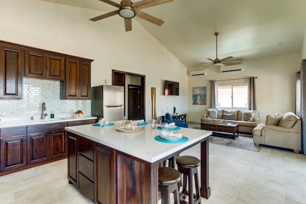 A Karib-tengerre néző, trópusi növényekkel szegélyezett, jól felszerelt 2 hálószobás/2 fürdőszobás tengerparti otthon minden kényelmi szolgáltatást kínál: 1250 sf kényelmes lakóterület, székesegyházi mennyezet, szekrények, kiváló WiFI, Kábeltévé, légkondicionáló, mosókonyha, teljesen felszerelt konyha hűtőszekrénnyel/fagyasztóval, mikrohullámú sütővel, kávéfőzővel, mosogatógéppel és központi szigettel reggelizőbárral, valamint 600 sf árnyékolt verandával a teljes magánéletért! Áraink TARTALMAZZÁK A szállodai/idegenforgalmi adót.