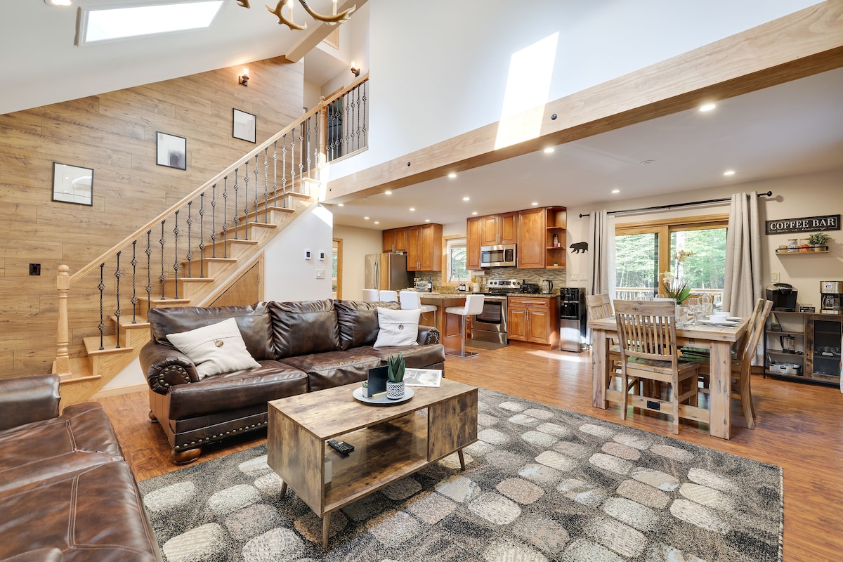 Vaulted ceilings, living room fireplace, 2 first floor bedrooms in this airy and private 4-season cabin with easy access to the amenities in the area. The house is a short walking distance to the indoor pool (open Labor Day to Memorial Day), and just a street away from a beautiful state park with over 2000 acres to explore with trails and a sandy beach 250 acre lake. The outdoor pool, beaches, tennis courts and more are open Memorial Day to Labor Day. 3 Ski slopes are less than 30 minutes away.