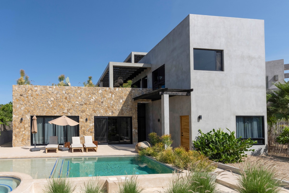 Üdvözlünk a Villas Tres Tierrasban! Ez a lenyűgöző, modern, 2 hálószobás, 2 fürdőszobás otthon gyönyörű medencével büszkélkedhet, amely egy 0,9 hektáros területen terül el. Mindössze 5 perc autóútra vagy 10-15 perc sétára található Baja Sur egyik legszebb strandja. A Tres Tierras tökéletes menekülés a mindennapi élet nyüzsgésétől. Ez a nyugodt kiruccanás az otthonod távol az otthonod, ahol nyugodtan pihenhetsz és megfiatalodhatsz. Üdvözlünk Baja!