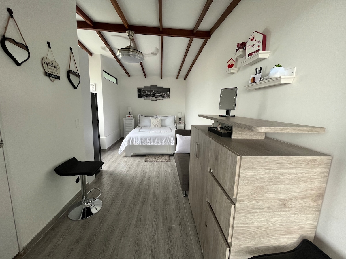 Disfruta experiencia de lujo privada en alojamiento confortable y autónomo en 2o. piso. A/C. excelente ventilación e iluminación, con ubicación estratégica. Cocina equipada, sala, comedor, lavadero y cómodo dormitorio. Nevera, lavadora, TV, WIFi privado y veloz, cerradura digital. cerca al Aeropuerto, via Bogotá por la calle 48. Fácil llegada, próximo a tienda D1 , enseguida a instalaciones de Coca-cola. Ideal para turistas, estudio y teletrabajo, Parq. gratis para automóvil. RNT 125181.