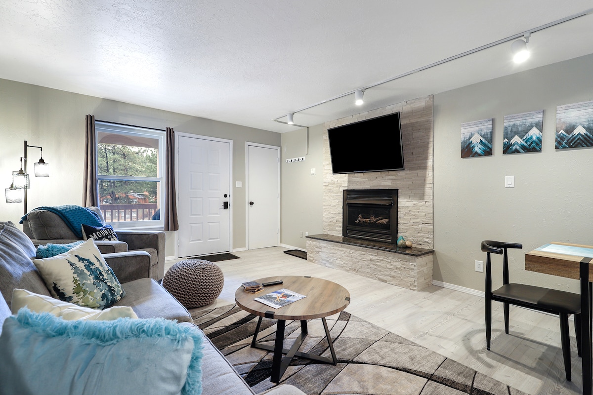 Enjoy a cozy and stylish experience at this great located condo. Walking distance to Angel Fire Resort! This unit has been completely remodeled with guest comfort at the top of the priority list! The setup is great for up to 4 people with a nice king sized bed in the master and a queen sized sleeper sofa in the living room! Plenty of deck space outside of the condo and some amazing mountain views (Wheeler Peak - tallest in NM, can be seen from the bedroom)! 2 HUGE smart TVs (75" in the bedroom)!