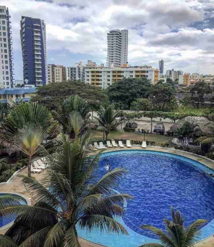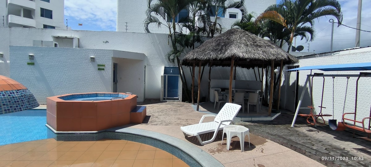Apartment in Tonsupa Beach, in Atacames, Esmeraldas. 3 háztömbnyire a strandtól, a Diamond Beach szektorban, a Club of the Pacificben. Kiváló elhelyezkedés szupermarketek, ATM-ek és éttermek közelében. Kicsi, privát és biztonságos készlet. Parkolóhellyel, úszómedencével, jacuzzival és kültéri zuhanyzóval rendelkezik. Maximális kapacitás 10 fő. Van wifi, meleg víz, felszerelt konyha, tévé, ventilátor, két hálószoba, két fürdőszoba, három ágy és két kanapéágy. Nagy erkély.
