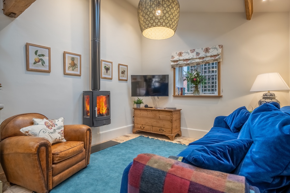 For over a hundred years, this characterful old dairy was where the cows were milked at Hawthorn Farm. Sympathetically and luxuriously converted into a two-bedroom cottage in 2017, it is self-contained and completely detached. Inside, original walls, beams and vaulted ceilings give it a spacious, airy feel. It has its own fully-equipped kitchenette, and a bathroom with a large shower, WC and basin. The spacious 18 x 14 foot carpeted living space has two huge comfy sofas and a table and chairs.