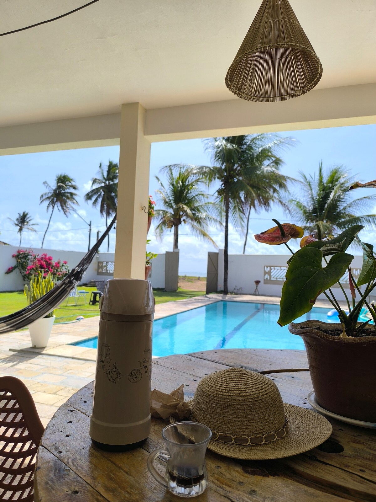 Ház üveg homlokzattal és panorámával a tengerre . Hangulatos légkör, olyan dekorációval és világítással, amelyet úgy terveztek, hogy kényelmet és nyugalmat biztosítsanak. Parkolás 6 autó számára. Privát biztonság. 2 nagy erkély, medence, grillező. 4 lakosztály légkondicionálóval és elektromos zuhanyzóval (2 minibárral). Wi-Fi; Smart TV (Youtube, Netflix, Globo play e Prime vídeo). A teljes konyha minden felszereléssel (fagylalt, fagyasztó, mikrohullámú sütő stb.) Teljes ágynemű ágyhoz, asztalhoz és fürdőszobához.