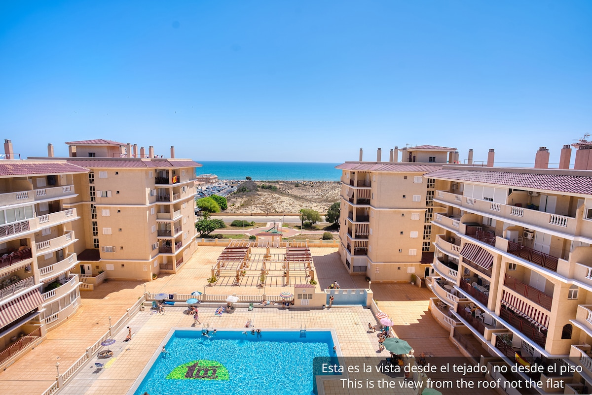 A tengerparton, a tengerpart finom homokja mellett található ez a gyönyörű, vadonatúj lakás, 2 hálószobával 4 fő számára, La Mata tengerpartján. Érezni fogod a tengeri szellőt a teraszodról. Az apartman a földszinten található, és egy nagy teraszból áll, ahonnan lenyűgöző kilátás nyílik a tengerre, a nappaliból, a konyhából, a 2 hálószobából és a 2 fürdőszobából. Fel van szerelve légkondicionálóval, WI-FI-VEL és parkolóhellyel. Van egy közös medence és egy nagy szolárium grillezővel.