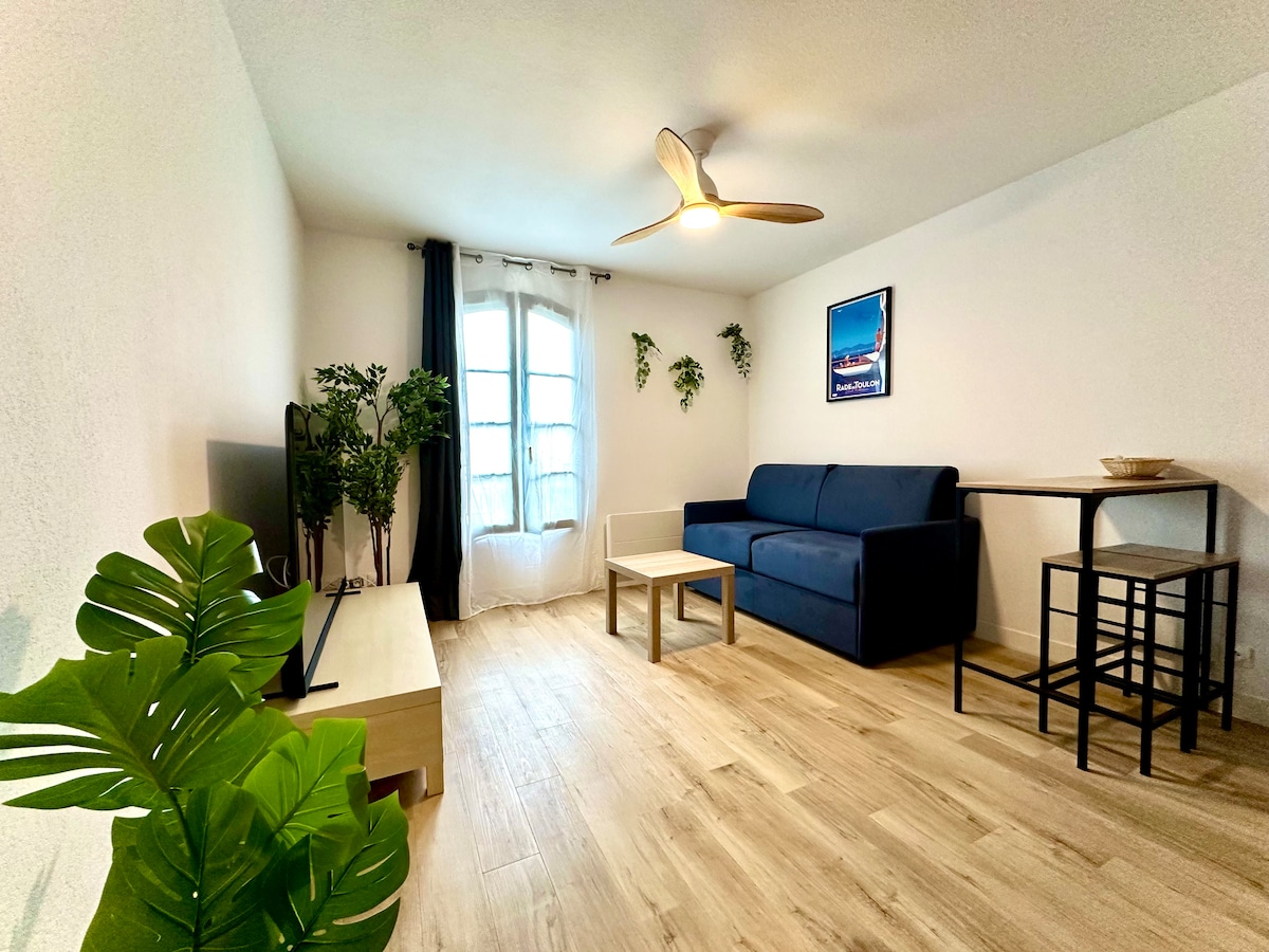 T2 apartment of 50m2, on the second floor of an old building in the heart of the city center, in a walking zone, in Toulon. Élénk és barátságos környék, borbárok, éttermek, üzletek és üzletek, galériák az épület lábánál! Gyönyörű nappali, nappali 2 kanapéval (kanapéággyal) és étkezővel, felszerelt konyha és egy nagy hálószoba (160 cm-es ágy) fürdőszobával (fürdőkád) és vécével. Gyalog 10 percre leszel a vasútállomástól, 2 percre a buszoktól és hajóktól