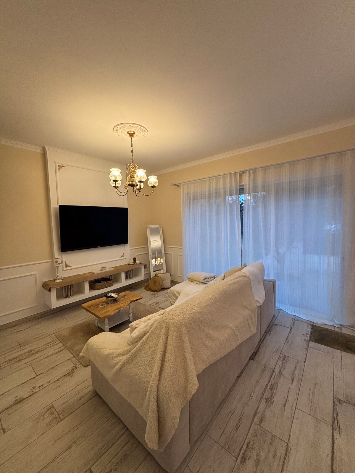 45 m2-es lakás a földszinten, 20 m2-es terasszal, felújított , 1 hálószoba tévével, önálló bejárattal. Főszoba felszerelt konyhával, mosogatógéppel, hűtő-fagyasztóval,sütővel, mikrohullámú sütővel, indukciós főzőlappal, kávéfőzővel, vízforralóval. A nappaliban egy kanapéágy található 160-ban, nagyon kényelmes. Lesz egy fürdőszobád zuhanykabinnal. Ágynemű és törölköző biztosított az ágyhoz , felár ellenében 10 euró a lepedőkért. Háztartási termékeket biztosítunk.