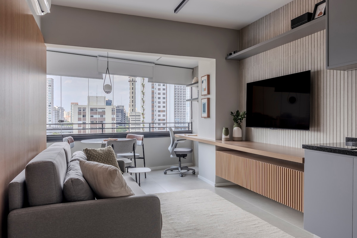 Pihenj ezen az egyedülálló és csendes helyen. Teljesen felszerelt konyha, 43 hüvelykes okostévé, mobil ventilátor a hálószobában, törölközők és ágynemű, gyönyörű kilátás, közel a bevásárlóközponthoz, a metróállomáshoz és a CPTM vonathoz, 15 percre a Congonhas, Berrini és Pinheiros repülőterektől, mindössze 7 perces sétára az EXPO TRANSAMERICA-tól, 10 perces sétára a VIBRA-tól, 15 percre az Interlagos versenypályától, parkolás az épület mellett 10,00–25,00 R$-ért 12 órára vagy ingyenesen az utcán ÉRKEZÉS 15 ÓRA UTÁN