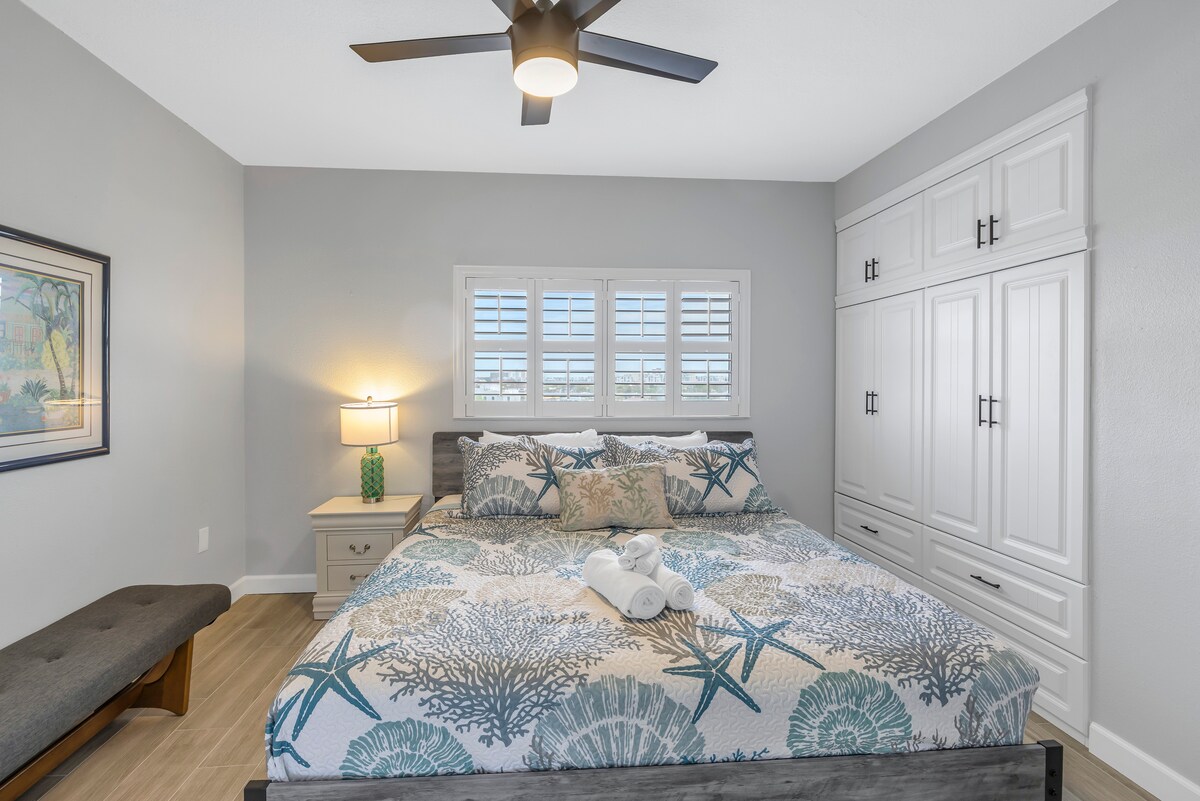 ⭐️⭐️⭐️⭐️⭐️ Kivételes szolgáltatás és szállás A nemrégiben felújított, modern, három hálószobás, két fürdőszobás otthon stílusos, nyitott konyhával rendelkezik, amely vadonatúj készülékekkel, gránit pultokkal és stílusos reggelizőpulttal büszkélkedhet – tökéletes a mindennapi élethez és a vendégfogadáshoz is. A szálláshely ideális elhelyezkedése miatt tökéletes a tengerpart szerelmeseinek, és csak egy rövid sétára van a Treasure Island cukorfehér homokjától, valamint a közeli éttermektől, üzletektől és helyi látnivalóktól.
