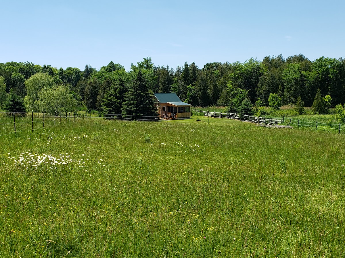 Egyedi „glamping” élmény! Gyönyörű miniház (10 láb x 10 láb, alatta hálógalériával), amelyet egy építész tervezett, Ontario vidéki domboldalán, mindössze 4 km-re a művészi város, Warkworth-tól. 30 hektárnyi terület, sétálóutakkal az erdőben, melléképület, meleg vizes szabadtéri zuhany, nagy terasz a csillagnézéshez, tűzrakóhely, kis pezsgőfürdő, hűsítő medence nyáron.