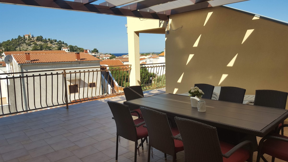 Ez az egyik a két apartman teljesen felszerelt, teljesen modern, újonnan épült kővilla. Csodálatos kilátás nyílik a régi város, tengeri kikötő, tenger és kilátás nyílik a szigetekre (nemzeti park Kornati). Ez a város központjában, de távol a zajtól, és csak 50 méterre a strandtól. Területén 2 erkély ülő és étkező bútorokkal, 2 hálószoba nyitott nappali nagyszerű kilátással, nagy üvegablakok, ingyenes parkolási lehetőség a villa előtt,légkondicionáló, ingyenes gyors internet