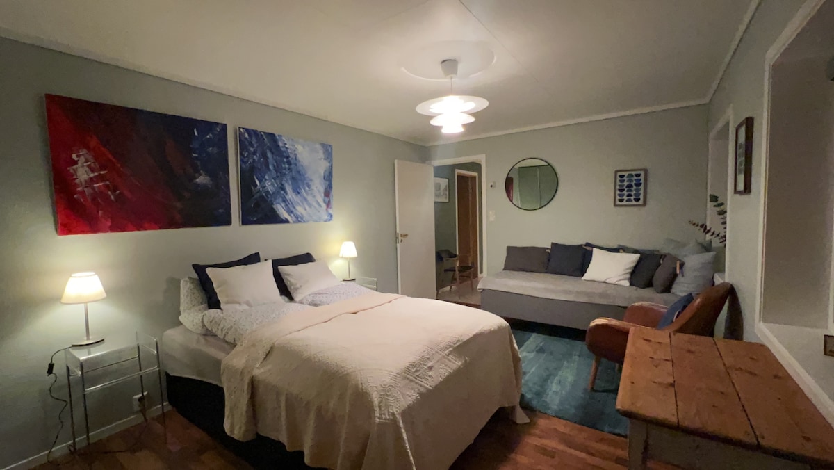 Üdvözlünk a vendéglakásunkban! MEGJEGYZÉS: 2025. július 5. – augusztus 4.: Legalább 3 éjszakás foglalás. Itt van a saját bejáratod, tágas kilátás Trondheimre, két tágas hálószoba sok alvóhellyel, nagy nappali és nagyszerű fürdőszoba szaunával. A konyha fel van szerelve mindennel, amire szükséged van, és az asztal kihúzható, és még több helyet biztosít! Parkolj a szabadban, vagy szállj fel metróval 10 méterenként Trondheim városközpontjába 12 méteren belül. Sétatávolságra van a busz, a bolt, a gyógyszertár és a játszóterek.