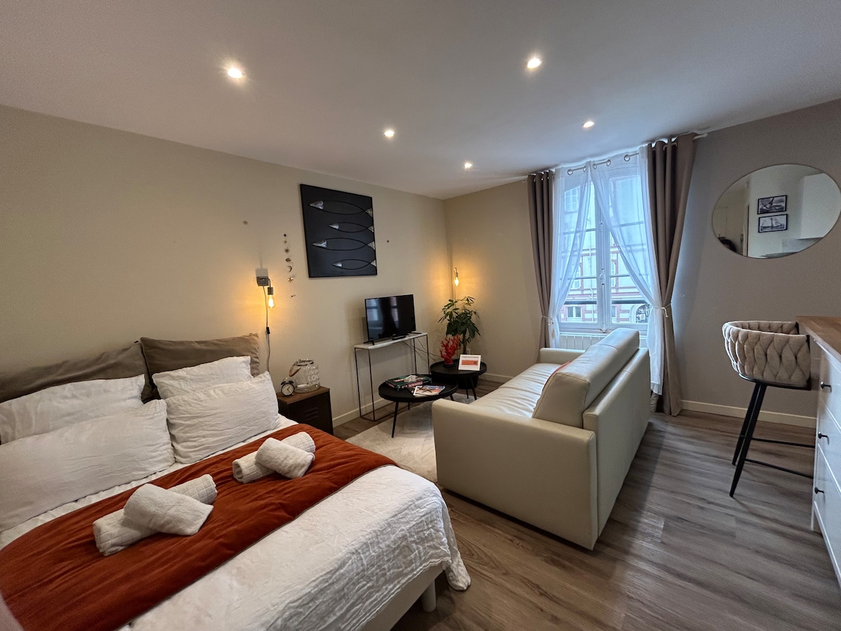 Fedezze fel ezt a gyönyörű, felújított stúdiólakást, amely ideálisan fekszik Honfleur szívében, 10 méterre a kikötőtől és 2 perc sétára a Place Sainte Catherinetől. Élvezd a nagy, déli tájolású erkélyt, amelyről lenyűgöző kilátás nyílik az egész városra. Queen size ágy 160x200, felszerelt és berendezett konyha, modern fürdőszoba. Ingyenes parkolás 500 méterre. Csendes és biztonságos lakóhelyen található PMR lifttel. Rugalmas érkezési idő. Nagyszerű egy tökéletes szálláshelyhez két főre!