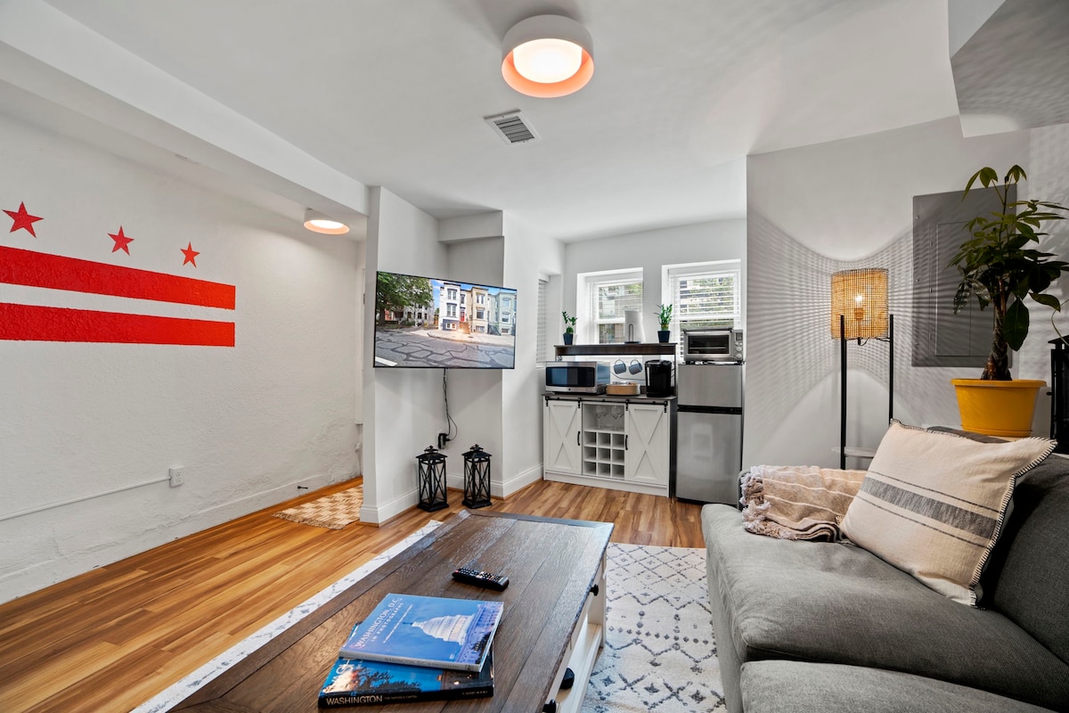 A történelmi DC környéken, egy csendes, zöldellő utcában található stílusos, 875 négyzetméteres angol alagsori lakás tágas és világos, és kényelmes alvóhelyet biztosít négy fő számára. A lakásnak van egy saját bejárata, valamint egy mosógépe és szárítógépe is. Ideális hosszabb távú foglalásokhoz. Sétatávolságra vagyunk az éttermektől, üzletektől és élelmiszerboltoktól a Union Market, a H Street, a Bloomingdale és a Shaw területén. A belváros/múzeumok és a MedStar, a Gyermek- és Howard kórházak könnyen megközelíthetők.