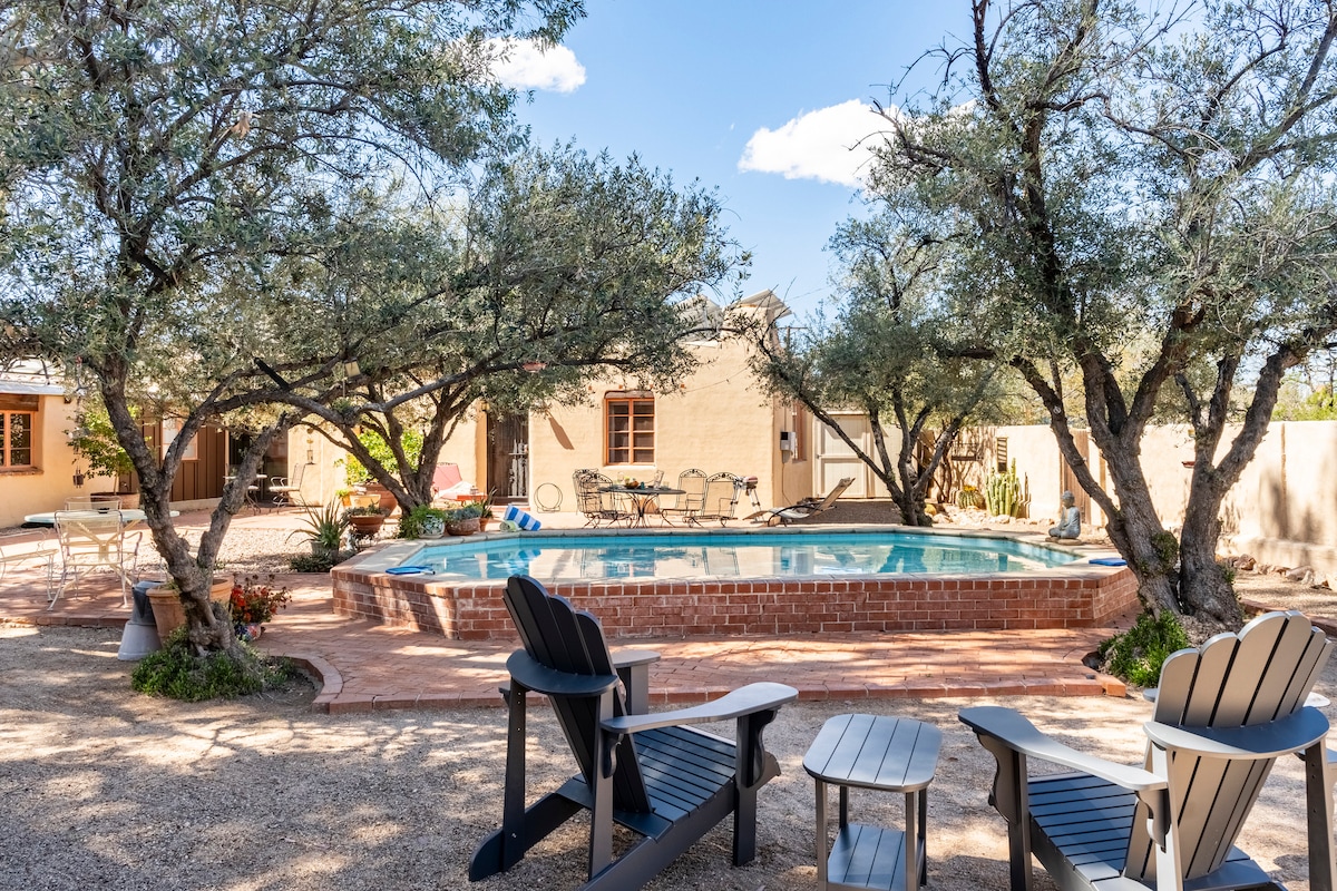 1937-es vályogbungaló a történelmi Palo Verde negyedben, mindössze néhány percre az UofA-tól, a belvárostól, a Banner Medical Center-től, a Tucson Botanical Gardens-től és néhány háztömbnyire az Arizona Inntől. A vastag vályogfalak és a kétszárnyú ablakok csendes menedéket nyújtanak. Élvezd a fedett teraszt, az érett, jól karbantartott sivatagi tájat - elöl és hátul -, valamint a privát szabadtéri zuhanyzót. A modern kényelem és a vintage báj kombinációja, beleértve a csúcskategóriás készülékeket és a szekrény/íróasztal/lehajtható ágy kombinációját