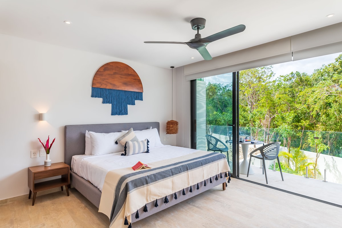 Üdvözlünk ebben az aprólékosan megtervezett stúdióban a nyüzsgő Tulum Centróban. Tökéletes egyedül utazóknak vagy pároknak, ötvözi a kényelmet, a stílust és a kényelmet. King-size ággyal, okostévével, teljesen felszerelt konyhával és saját, kertre néző erkéllyel rendelkezik. Élvezd a tetőtéri medencét, az evezős teniszpályát és az élénk művészeti installációkhoz való hozzáférést. A foglalásod ingyenes concierge-szolgáltatást és Tulum néhány legjobb strandklubját részesíti előnyben.