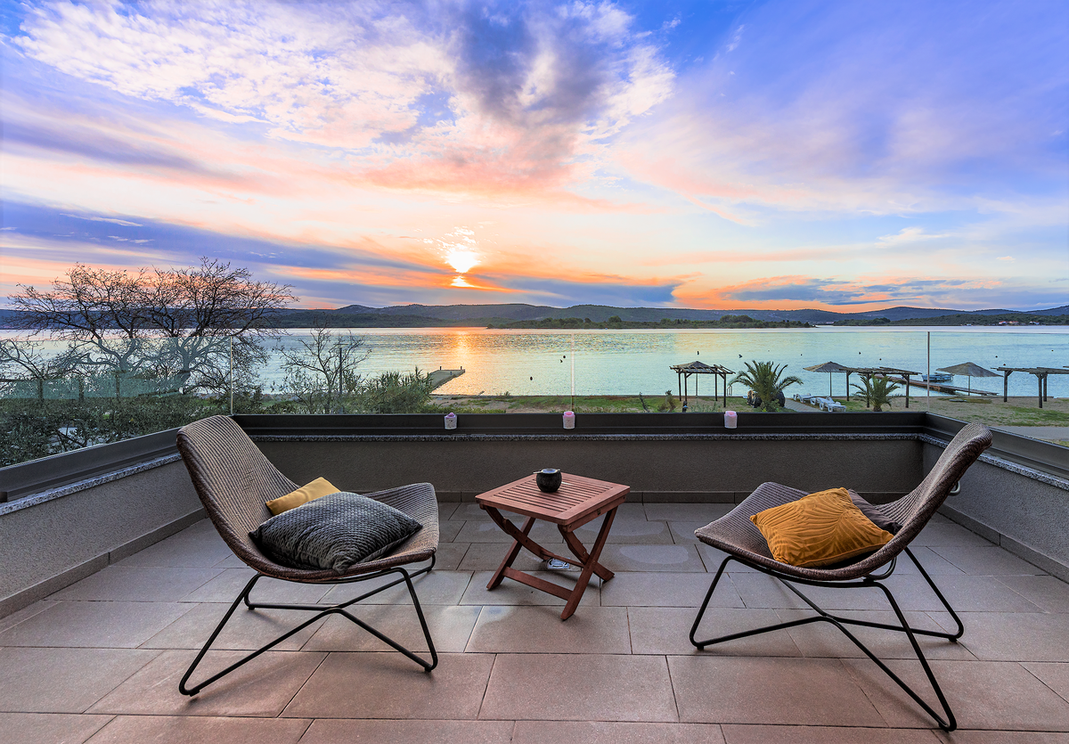 A ház 10 méterre található a tengertől. Az erkélyen található apartmanokban 5 fős privát pezsgőfürdő található. A ház előtt, közvetlenül a tenger mellett található egy kis kert grillezővel és egy nagy, 8 fős asztallal, ahol a nyári szellőt a természetes árnyékban érheted el. A parton helyezzük el a napozószékeinket és napernyőinket, hogy élvezhesd a tengert és a napot. A ház előtt van a kis hajó vagy jet-ski kikötője (6 méterig). Az egész család ezen a békés szálláshelyen.