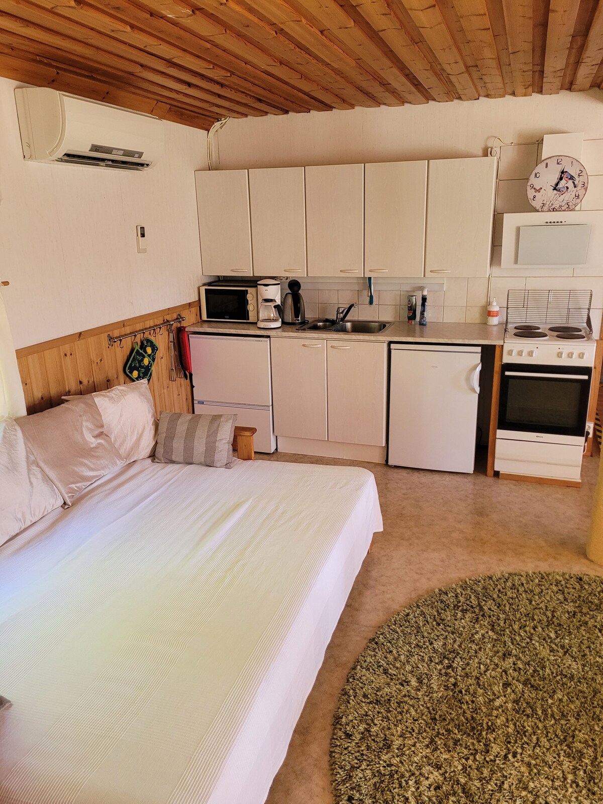 Felújított miniapartman egy szaunakabinban, ahol tiszta ágyneműben alhatsz (az ár tartalmazza). A saját védett teraszodról, részben tengerre néző kilátással. A szaunában található mosodát saját maga fűti (közös használat). Szauna is jár hozzá. Békés farmunkat gabona- és szénamezők veszik körül, és rengeteg hely van az udvaron sétálgatni. A parton úszhatsz, és megkérdezheted, hogy a kajakok vagy sok hely kiadható-e. Kevesebb mint egy kilométerre a Teijótól és kevesebb mint 5 kilométerre Matildától.