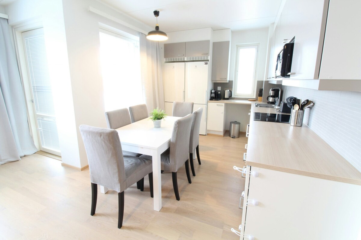 Apartment has a fully equipped kitchen with dishwasher and a spacious utility room with washing machine on the ground floor. The apartment has its own parking space. There are two bathrooms, both with shower . This apartment is suitable for more than one person for a longer period of time. The apartment is also a short distance from Helsinki-Vantaa airport and has excellent transport connections.