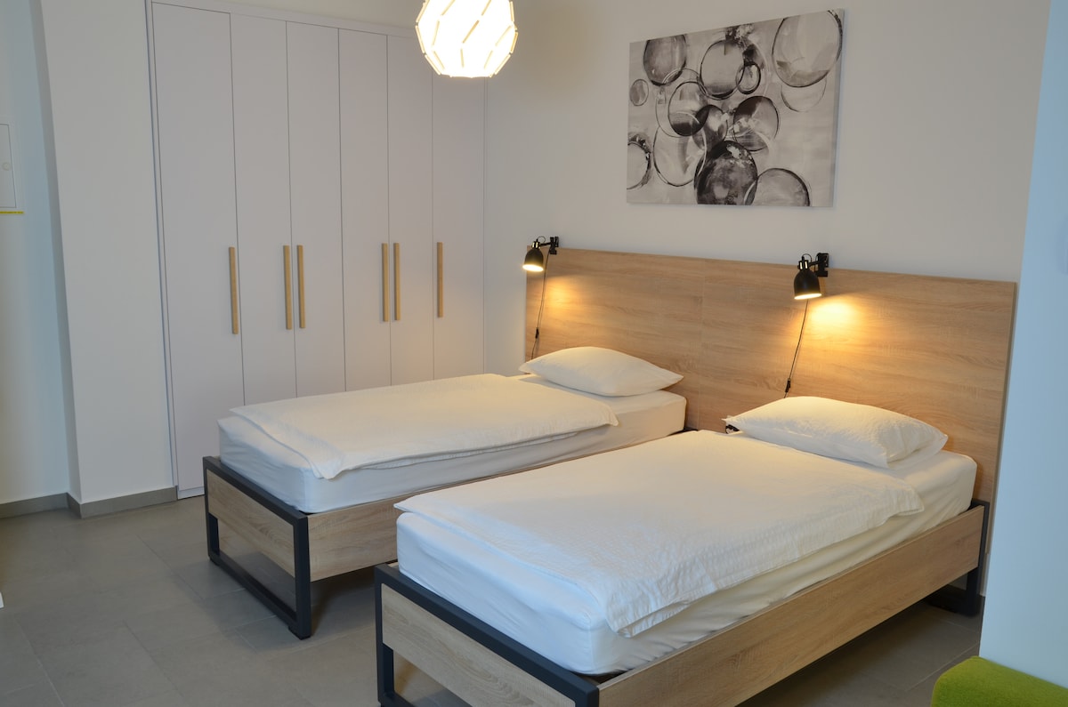 Élvezd ennek a belvárosi otthonnak a stílusos dizájnját. Az apartman 40 m2-es, és két fő elszállásolására alkalmas. Harmadik személy kérésre. Az apartman nyitott térrel rendelkezik, és két egyszemélyes ágyból áll, amelyek egy kétszemélyes ágyhoz, kanapéágyhoz, konyhához és fürdőszobához csatlakoztathatók. A konyha teljesen felszerelt, mikrohullámú sütővel, vízforralóval, kenyérpirítóval és hűtőszekrénnyel rendelkezik. Az apartman légkondicionált és padlófűtéssel rendelkezik. Ágyneművel és törölközőkkel van felszerelve.