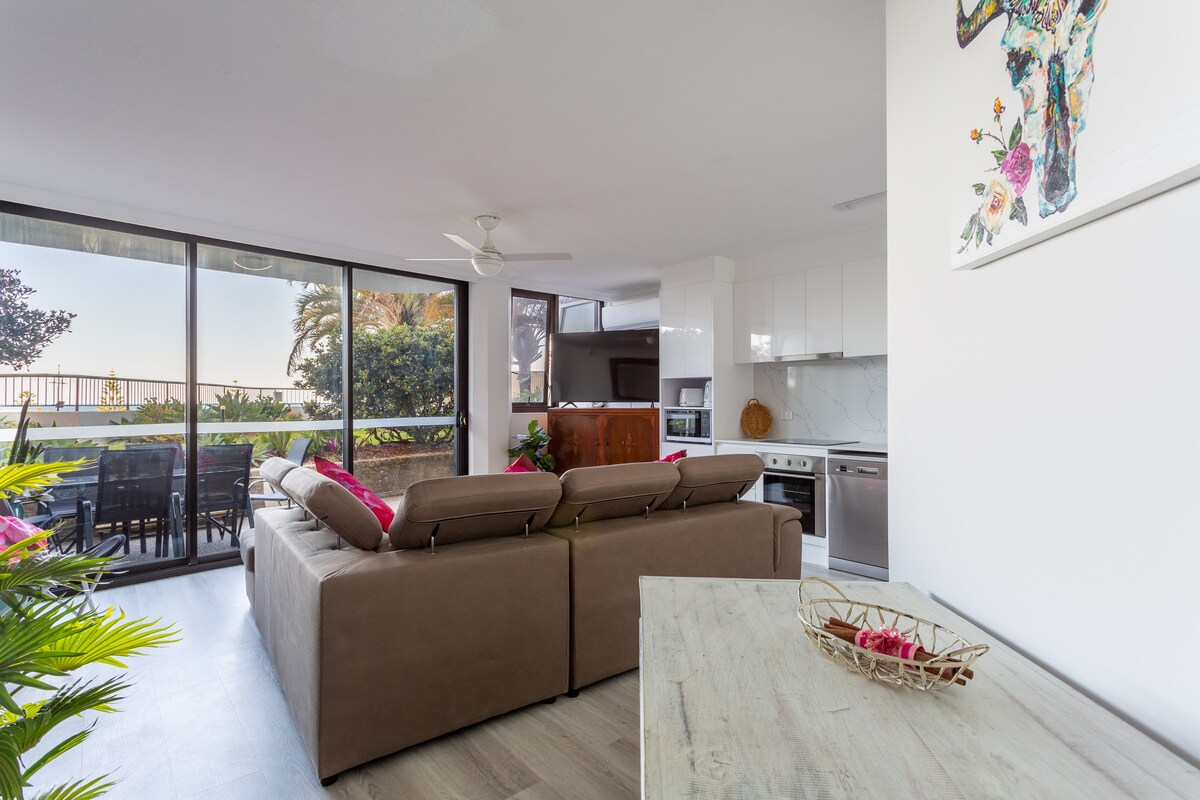 This modern & clean 2 b'room unit sits on the ground floor of the stunning Royal Palms Resort. The unit has direct access a grassy area & the pool with full beachfront views. Bright open plan living area includes stylish kitchen with new appliances & stone bench tops. An open plan lounge and dining area open onto their own private balcony. Renovated en suite & bathroom and laundry combined. Master also has its own private balcony with pool and beach views. Cafes, shops & restaurants close