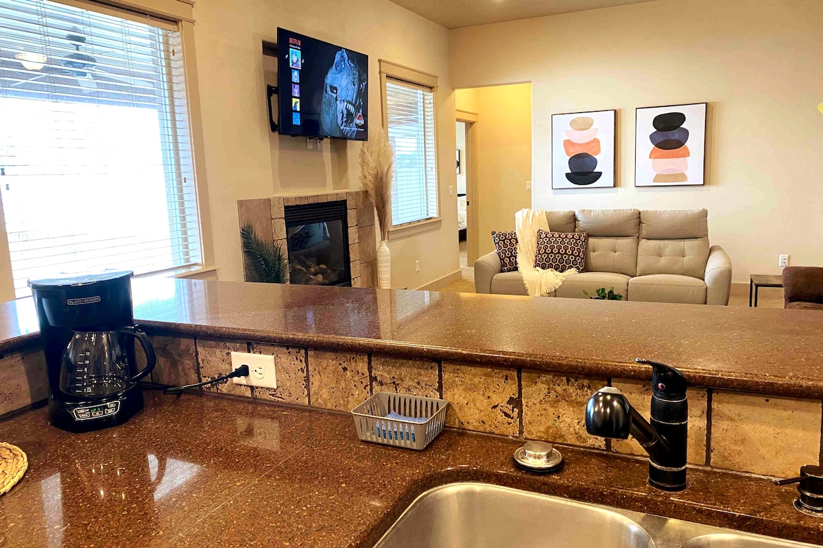Relax with the whole family at this peaceful home. Open concept w/ plenty of great seating to accommodate & entertain. Very New, cozy home, w/comfortable beds and fenced backyard w/ fire pit. Everything you need at your fingertips. Wonderfully located, walking distance to Thomsen park, close to everything. Downtown is 7 min, Sightseeing and Grocery nearby. Be sure to see the Perrine Bridge, Shoshone Falls, and stop by our amazing local Downtown Twin Falls or just Kick up your feet and enjoy.