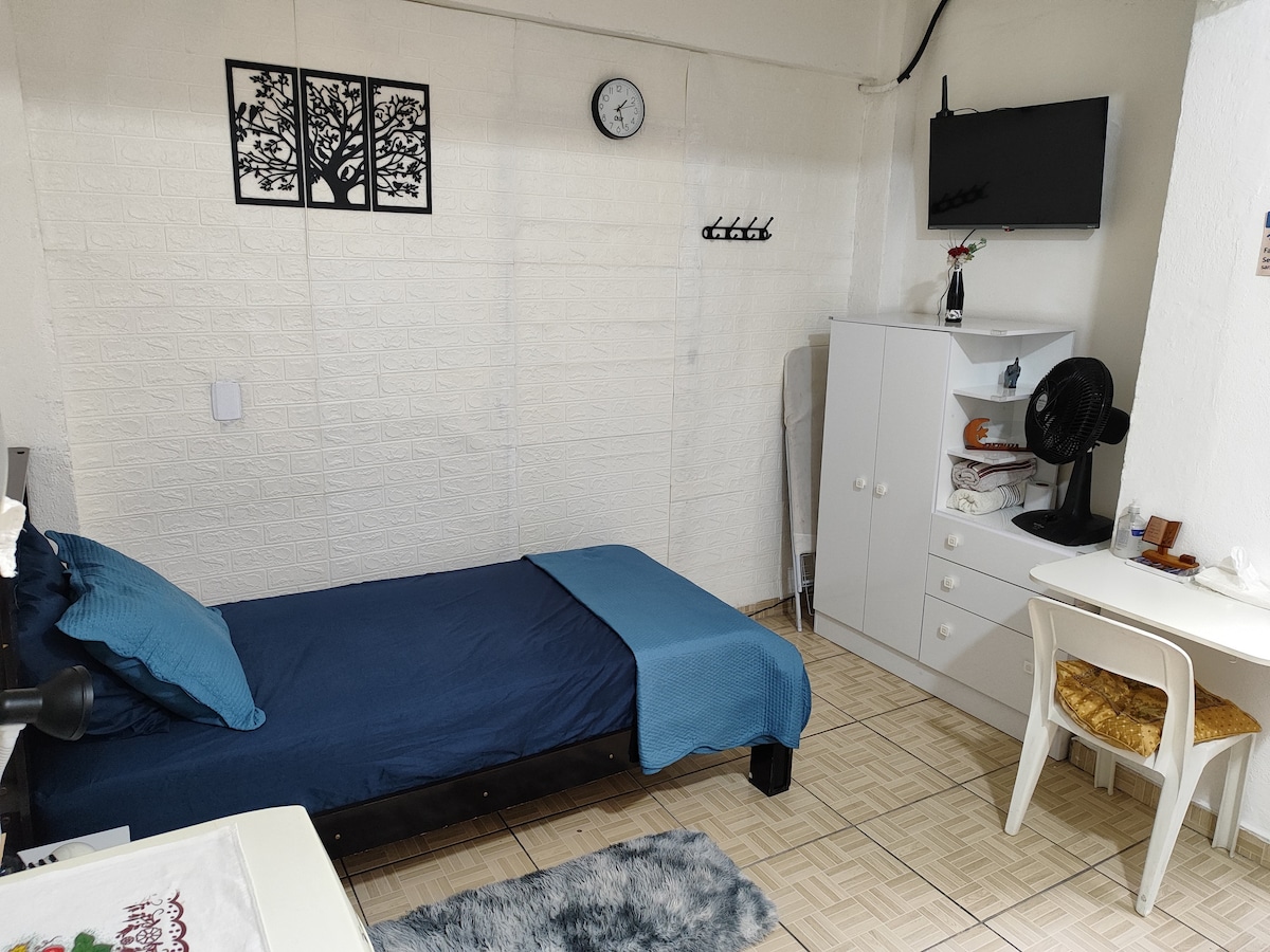 Egyágyas szoba fürdőszobával és minikonyhével.