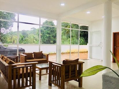 A zöldes környezettel körülvéve és a legjobb rész a gyönyörű folyó, amely a szobák előtt található. Különféle madárhangokat élvezhetsz az ingatlanban, az élményt, mintha a paradicsomban lennél. Az ingatlan egy és csak Srí Lankában található, amelyet a tulajdonos maga épített, és amely több százezer különleges követ használ.(videókat és képeket nézhetsz). Autentikus szafari túra és jógaélmény külön szakaszunk van a folyó előtt, ahol élvezheted, meditálhatsz és jógázhatsz.