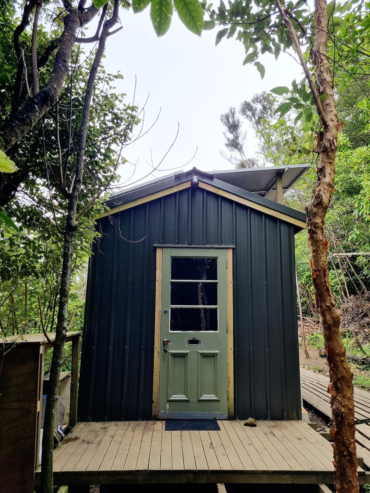 Whare manu is a private, self contained boutique cottage that is solar powered. Set back into native bush with views of the sea and beach, which is only a minutes stroll away. Watch the Tui's and Bellbirds feed on the sculpted bird feeder right on the deck. Designed for couples to relax, unwind and enjoy. No children please. If you would like your stay to include the 24 Dec please contact us, we can open for you, there are no checkouts on 25 Dec & a min 2 night stay. This is a unique place.