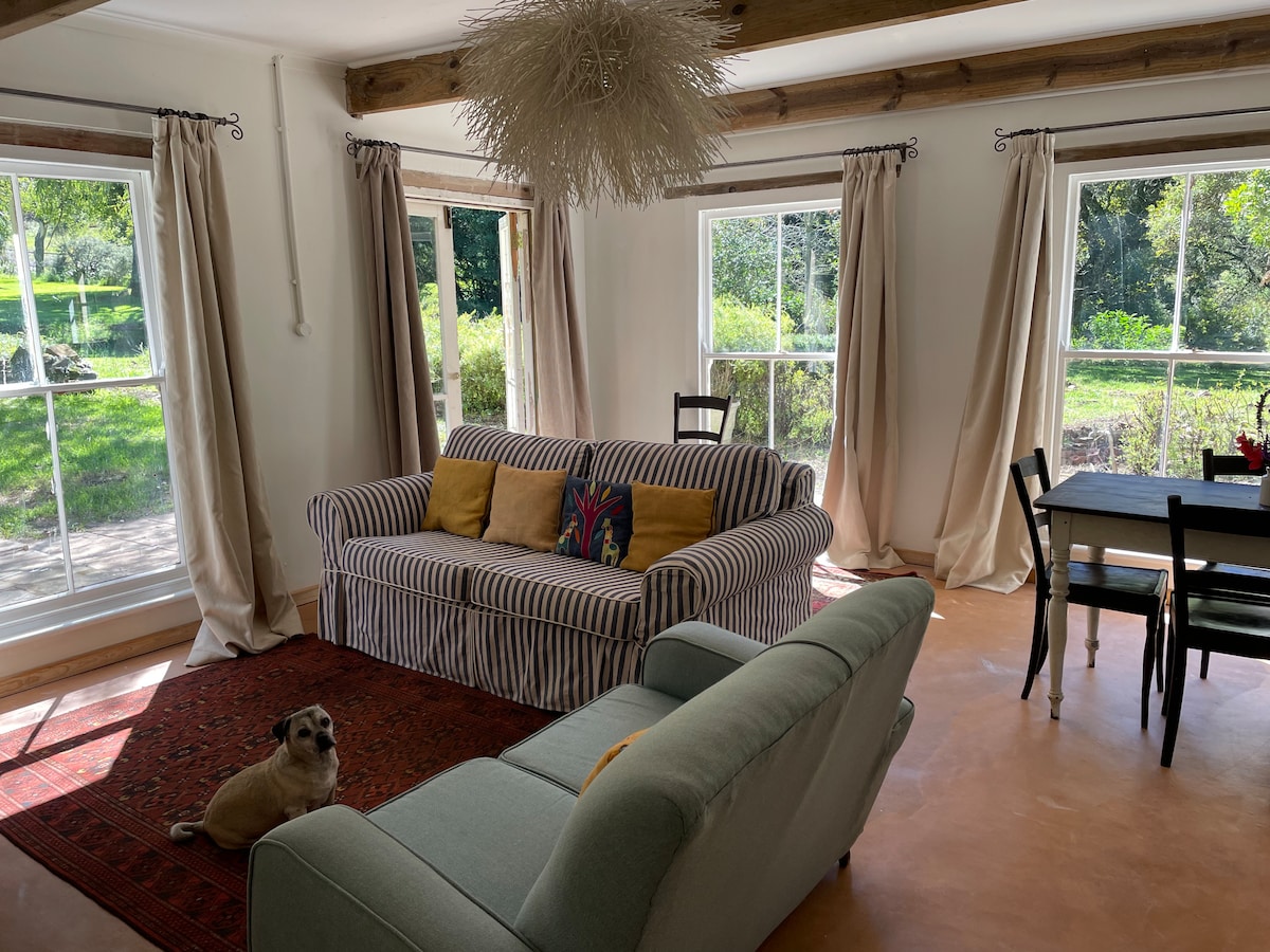 The cottage is on the edge of an ancient forest and perches on the side of a stream. The Narina Trogon and Hamerkop both nest close to the cottage - alongside various buck and many other wild creatures. The cottage is very well appointed with a full kitchen and dish washer, the bedrooms are both en suite, made up with the finest linen - a king size bed and either two 3/4 beds or another king. Persian carpets, a wood stove etc. The farm has many beautiful walks through the hills and forest.