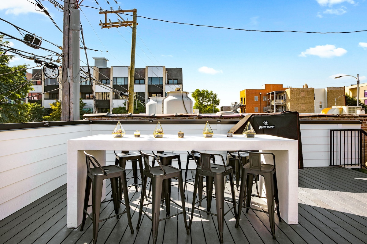 Élvezd a medencét és a kiruccanást a forró Logan Square-en! Átgondolt előkelő érintések mindenhol. Kényelmes helyen, egy fákkal szegélyezett Chicago Cul-de-Sac-on található, mindössze 5 perc sétára az L Blue Line-tól. Pihenj tágas szabadtéri lakótérben, tölts egy délutánt a medencében heverészve, grillezz és étkezz a teraszon, vagy koccints az udvaron található tűzrakóhely felett. Pár lépésre vagyunk a forró éttermektől és éjszakai élettől, beleértve Chicago első számú termelői piacát is. Ingyenes utcai parkolás vendégeinknek.