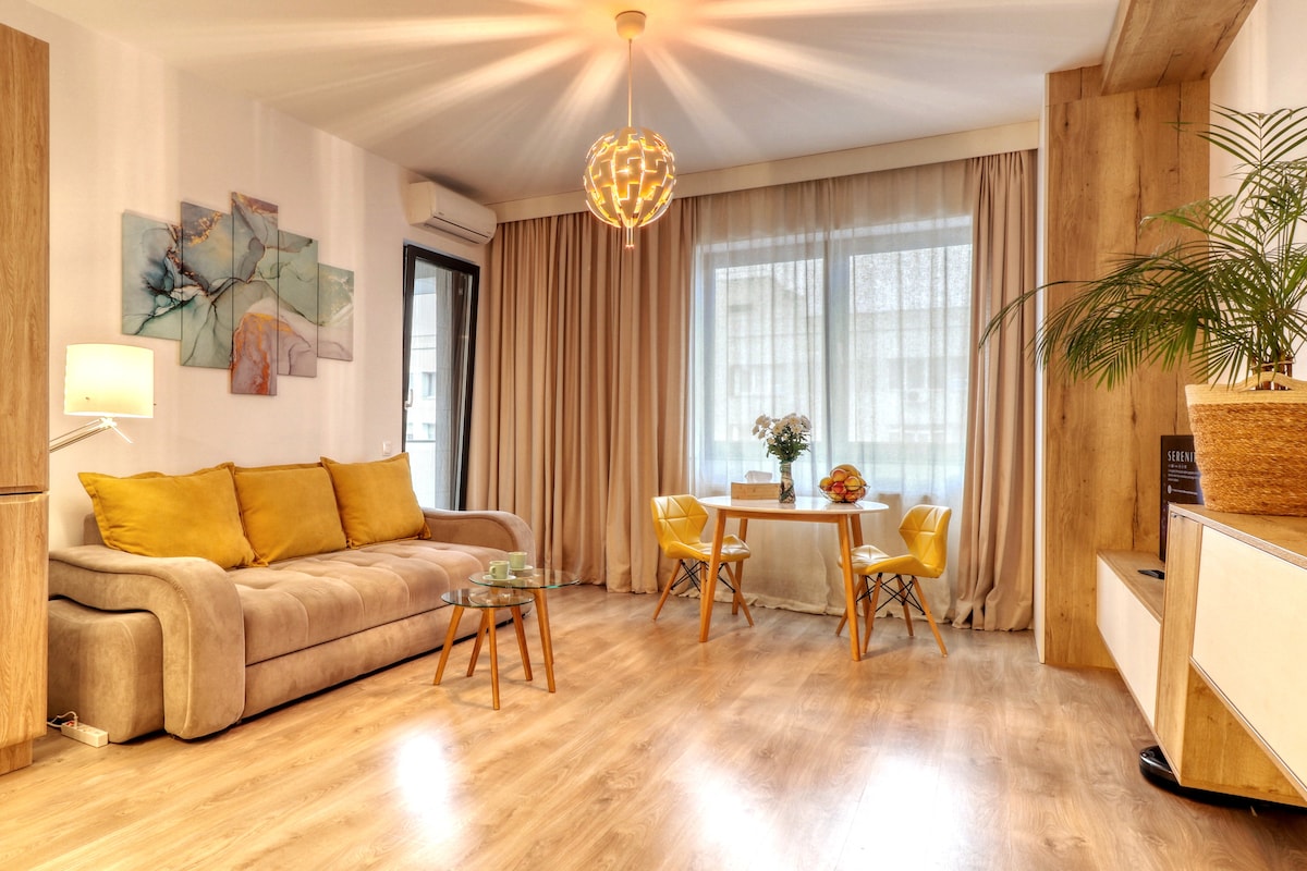Apartament spațios cu 1 dormitor și intrare privată, ideal pentru cupluri sau familii mici. Dispune de zonă de relaxare, baie cu cadă și uscător de păr, precum și bucătărie complet utilată cu plită, frigider, cuptor și ustensile. Beneficiază de încălzire și răcire prin ventiloconvectoare, TV cu ecran plat, mașină de spălat, aparat pentru ceai și cafea, zonă de luat masa și vedere la oraș. Oferă 1 pat dublu si o canapea extensibila și tot confortul necesar pentru un sejur plăcut.
