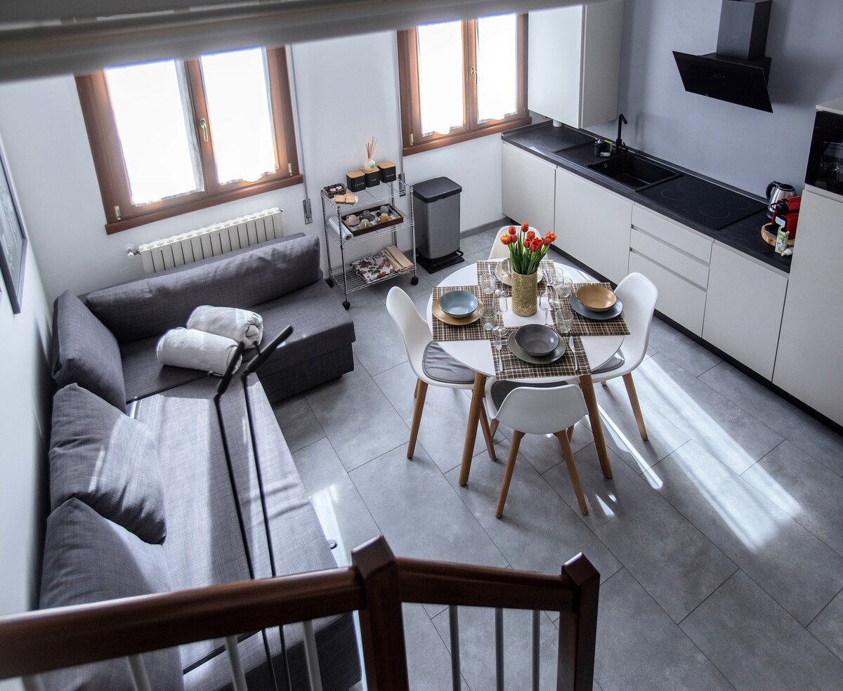 Magnificent accommodation with high-quality finishes located in the historic Piazza delle Erbe. The flat consists of: - Open-plan living room with dining table and sofas - Modern, fully equipped kitchen - Relaxation area with sofa and TV - Mezzanine with study desk - 2 bathrooms, one with glass shower cubicle and one with bathtub - 2 double bedrooms with queen-size beds - 1 double bedroom with king-size bed. The flat is only 30 minutes by train from Venice.