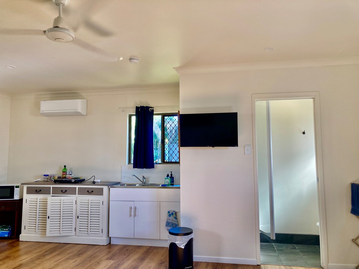 Üdv a stúdiónkban! 😊 A teljes hely a tiéd – WC/zuhanyzó, tea/kávékészítő felszerelés és reggeli alapanyagok. Teakonyha mikrohullámú sütővel, főzőlapokkal, fazekakkal és serpenyőkkel, hűtőszekrénnyel és kenyérpirítóval. Újonnan telepített légkondicionálás. Élvezd a saját békés oázisodat, amely mindössze öt perc autóútra vagy tizenöt perc sétára van a gyönyörű Hervey Bay strandoktól, és mindössze öt perc sétára a bevásárlóhelyektől és kisboltoktól. Van kölcsönözhető kerékpárunk, és bármilyen kérésben tudunk segíteni.