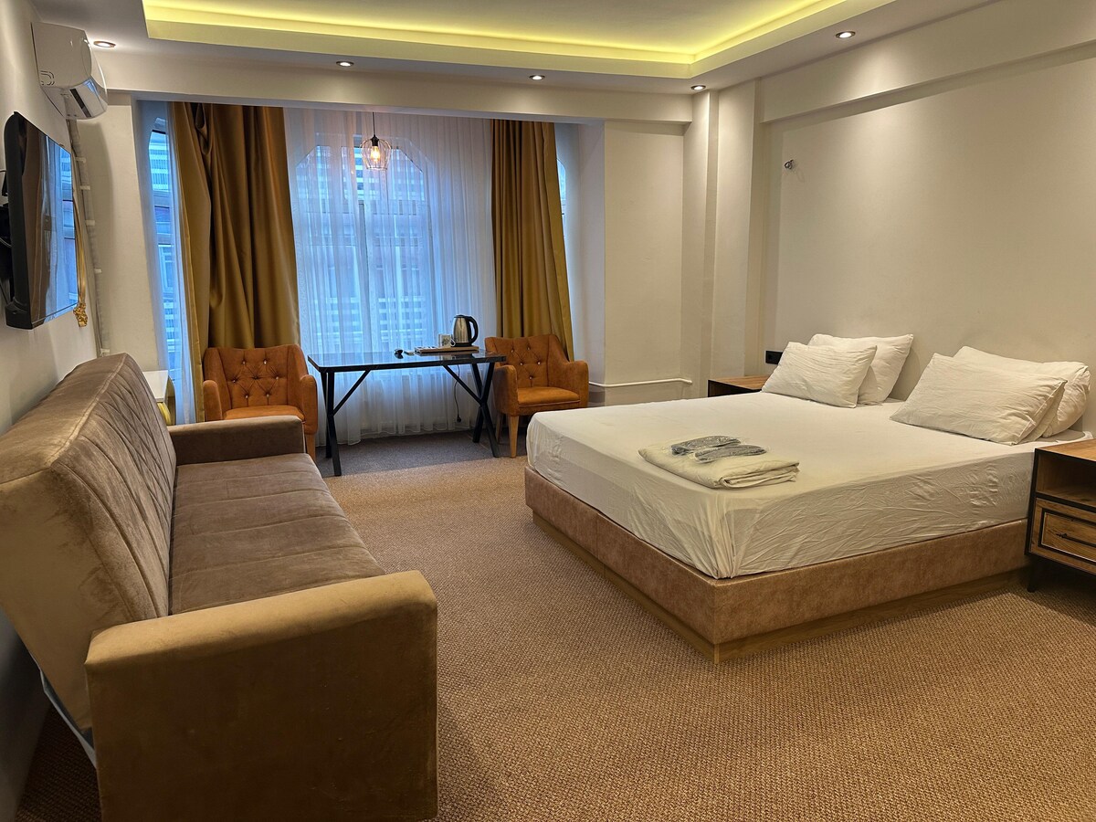 A Kadikoy központjában található, újonnan épült helyünk modern és kényelmes életet kínál. A hálószoba és a fürdőszoba együtt található. Az egész hely a tiéd. Nincs közös tér. Minden tétel megújítható. Mivel van acélajtó, biztonságosabb szállásszolgáltatást nyújtunk. A szobában van egy nagy franciaágy, tévé, légkondicionáló, hűtőszekrény, asztal, karosszék, szekrény, éjjeliszekrény, vízforraló és üdvözlőtálca.