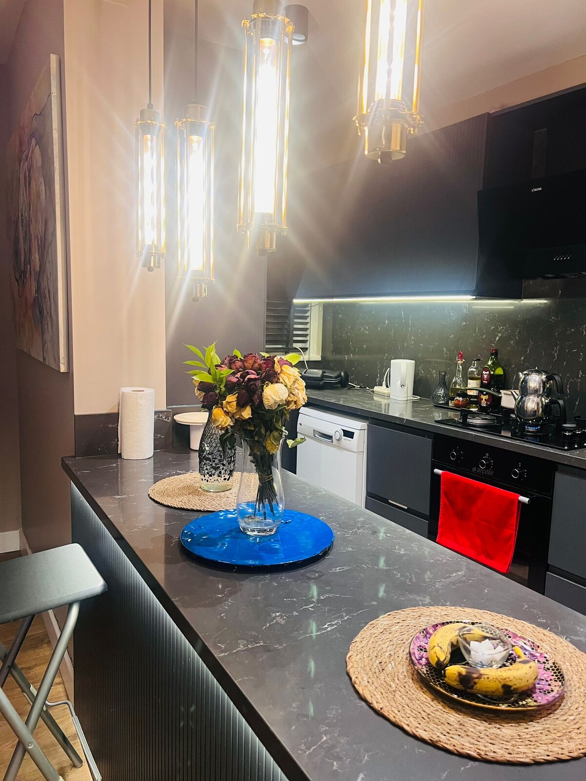 Great residence with bird looking from top at the center of the city. Amazing design of the residence will impress you. Moreover from top to bottom windows you will enjoy panoramic view of the city. Especially nights. All cooking equipment and hot drink machines you will reach at flat. Furniture are new and stylish. The position of the place is very strategic. Very close to bosphorus,3 big mall,watergarden etc. Not close only one place but also as strategic position easy react to everywhere.