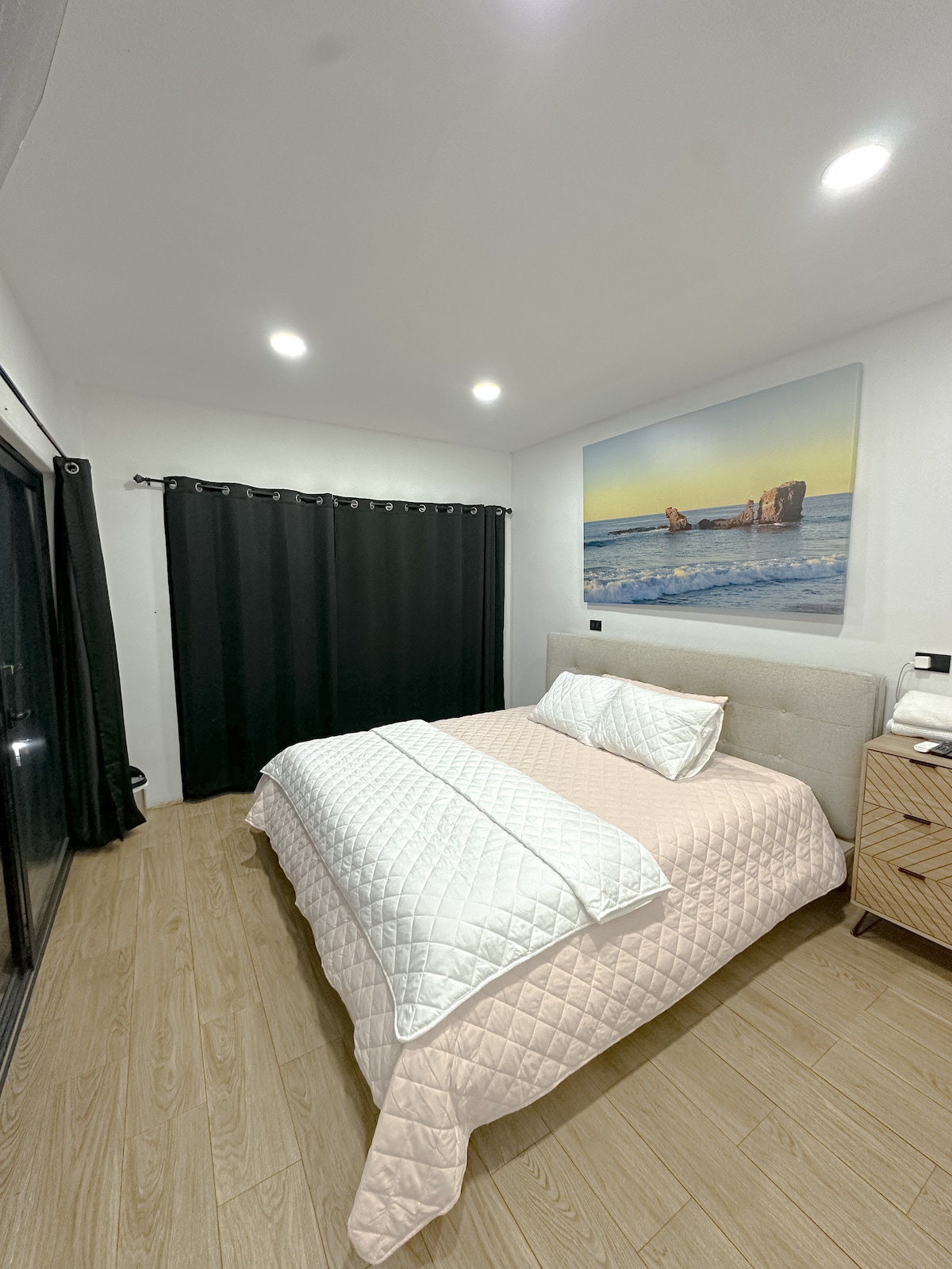 Relax in our comfortable and roomy 139 sq ft. beroom, featuring one queen bed and an optional inflatable queen bed (available upon request) to accommodate up to four guests. Enjoy the convenience of a Smart TV, high-speed internet, and air conditioning. The large and shareable modern full bathroom with a hot water shower is conveniently located across the hallway. *** Entire house for rent available upon request ***