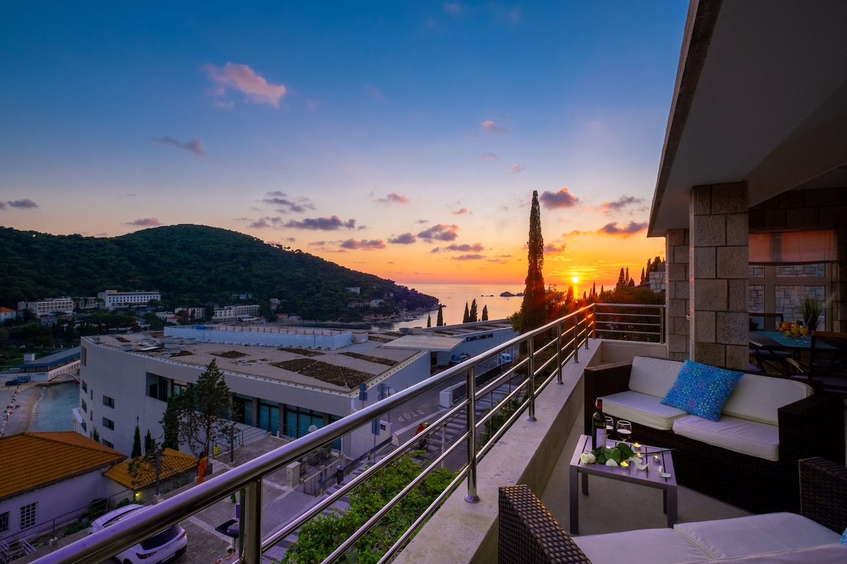 Direct sea view, lux.apt, max 8persons, by Sunset Lapad beach, 2 big balconies, 3bedrooms, 2bathrooms, supermarket-ground floor, lift, parking place in the underground garage 10 Euro per day, safety box, free WiFi internet. Restaurants, bars, supermarket, shops, ATM, bus & taxi by the building.