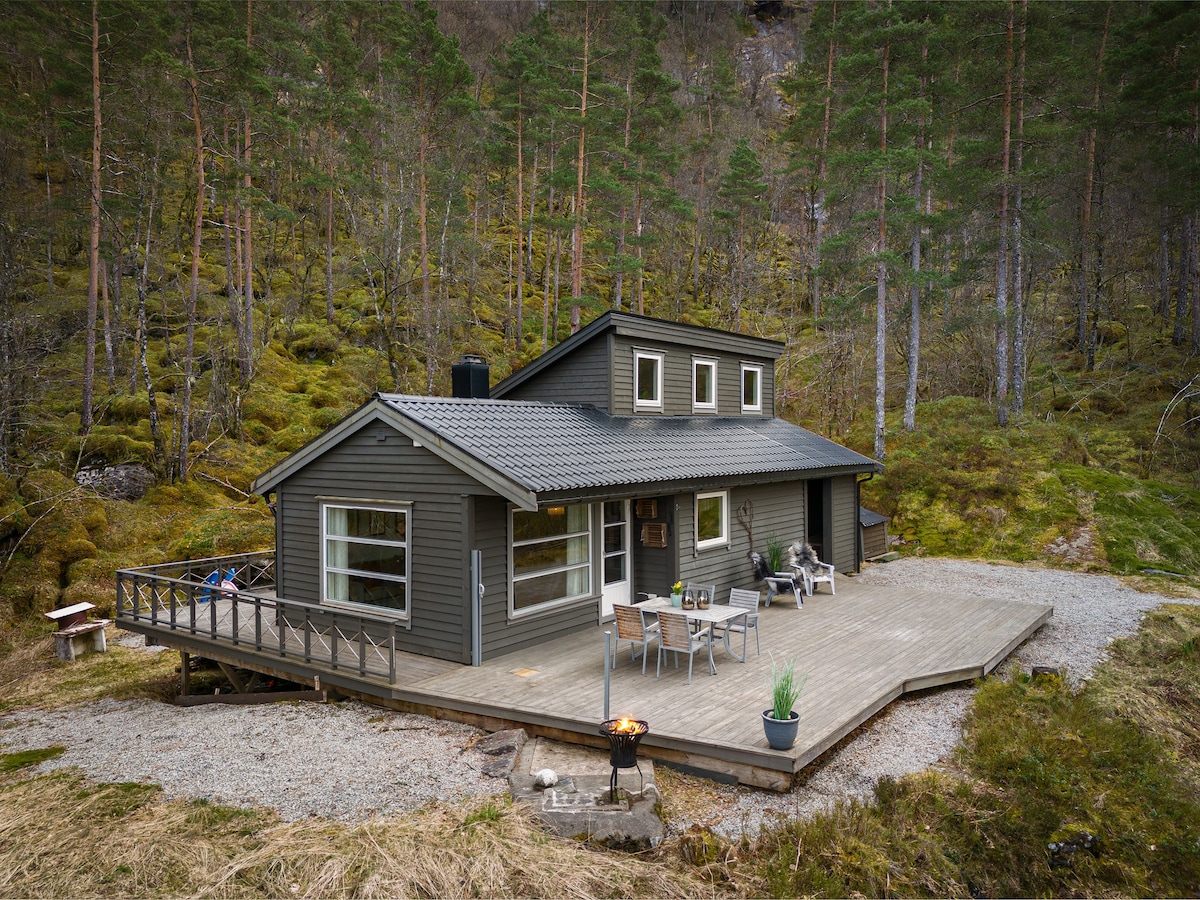Lite hus med 3 soverom med utsikt mot fjell og store fossefall. Huset ligger 200 meter fra sjøen, i den fredfulle landsbygda Eidsland. Til Bergen tar det 90 minutter å kjøre. Til Voss tar det 1 time å kjøre. Stedet byr på flott natur og fine turstier i skog og fjell. Ved sjøen kan du kan fiske eller svømme. Fiskekort må kjøpes ved fisking i elver eller vann. En kajakk er til fri disposisjon. Båtutleie i området. Sengetøy er inkludert. Wi-fi & Cromecast. Ikke TV-kanaler.