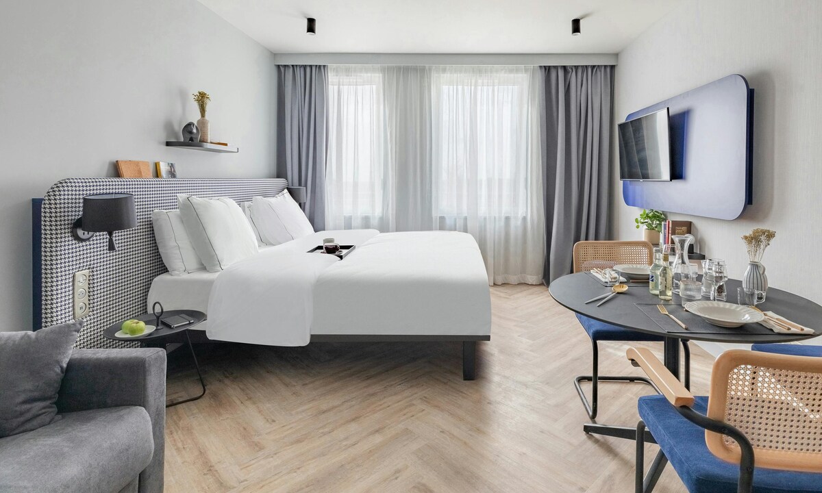 Szabványos kétágyas szobánk elegánsan van megtervezve, és pontosan erre van szükséged a nyugodt éjszakai alváshoz. Az egész arról szól, hogy nagyszerű ár-érték arányt érj el, és az egyszerű, alacsony szén-dioxid-kibocsátású megközelítésünkkel zölden tartsd a dolgokat. Élvezd a kényelmes ágyakat, az ingyenes Wi-Fi-t és az árnyékolókat a tökéletes alváshoz. Szoba mérete: 12nm. Vedd figyelembe, hogy az Airbnb ára nem tartalmazza a 3,25 EUR személyenként és éjszakánként fizetendő városi/idegenforgalmi adót, amelyet közvetlenül a szállodának kell megfizetni.