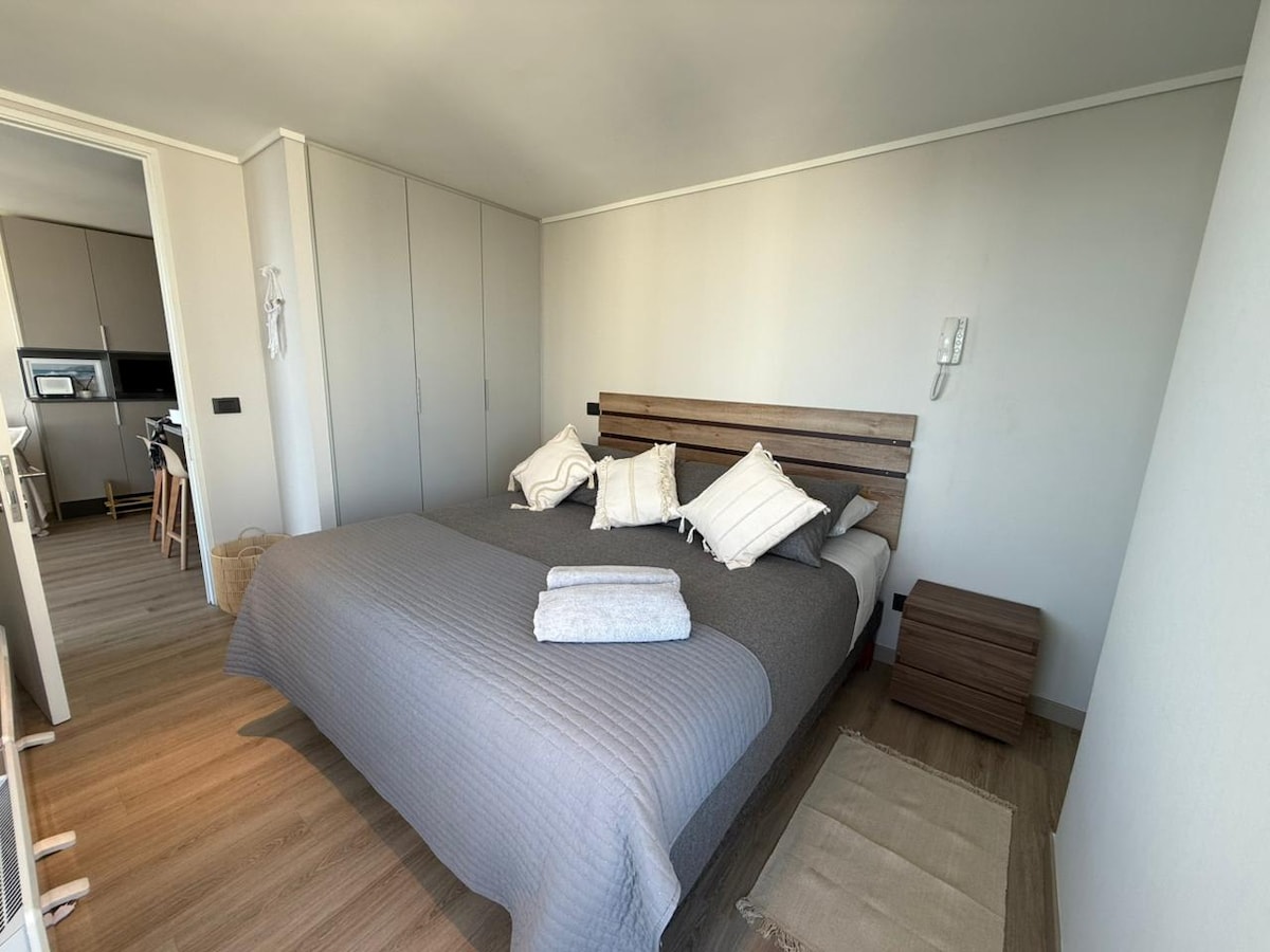 Cabaña una habitación grande, hasta 4 personas, terraza espaciosa frente al mar. 1 baño; cama y sofá cama 2 plazas; 1 closet; comedor, cocina equipada, parrilla electrica; TV SMART, WI FI ENTEL 400 MB FIBRA OPTICA; parlante, cerradura con clave; un estacionamiento interior gratuito .Piscina común,; conserje 24 horas, cámaras. Mascotas: Solo perros, cargo adicional 10.000. Terraza en altura., camino con escalas. Ingreso: 15.30 horas flexible. Salida: 12.30 horas, conversable.