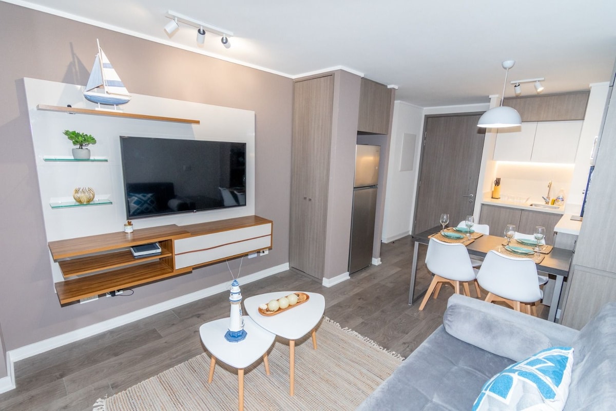 🤩COMFORTABLE AND NEW🤩 Apartment by the beach, 17 floor 🅿️Free Parking ✅Pool additional payment, 1 courtesy income 🏋🏻Gym 💨Sauna additional payment 😉Beautiful view of the city of Viña ✅It has heating and everything necessary for a comfortable stay 🔔Access by electronic lock 🚨No visits can be received ‼️All guests must register your ID to enter 🚭Prohibited smoking 📦We receive your online purchases
