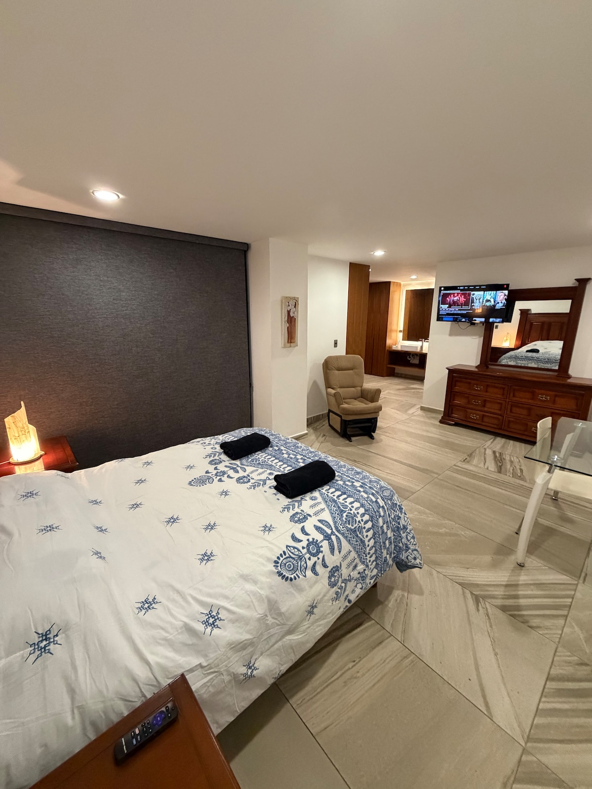 Hospédate en nuestro lujoso y exclusivo apartamento en el piso 22 de Torres Boudica con una espectacular vista de Puebla, cada espacio fue diseñado pensando en cada uno de sus detalles, desde el mobiliario hasta la decoración. Cada recamara tiene baño completo propio, closet, colchones, sabanas y edredones de calidad, SMART TV en cada recamara, bocina Alexa en la sala de estar, cocina equipada, WIFI, insumos de baño (toallas, jabón, acondicionador, shampoo y gel de ducha), lavadora, cafetera.