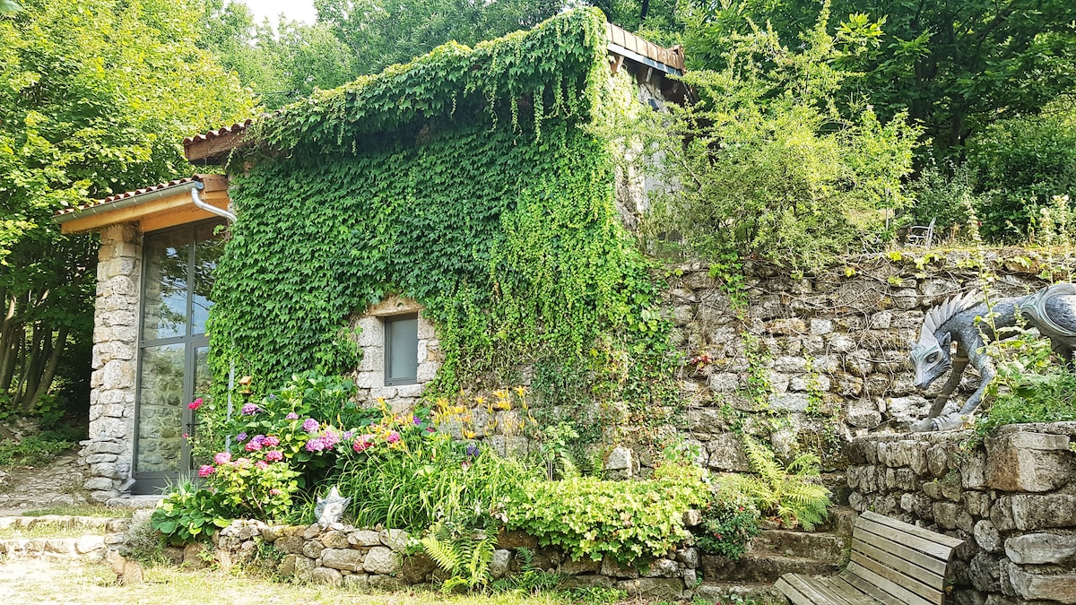 Notre maison se situe en Ardèche Méridionale à 10mn des Vans, dans un tout petit hameau en surplomb du Chassezac, à proximité de baignades secrètes et de balades enchantées, c'est une maison de pierres du XVII ème siècle qui abrite mon atelier de création et deux chambres d'hôtes. Un petit-déjeuner composé de produits faits maison ( pain, granola etc...), de produits frais issus de notre jardin ou de fermes avoisinantes installées en permaculture vous est offert.