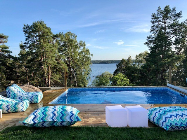 Ház a tenger mellett egy mólón👍Élvezd a pezsgőfürdőt és a fatüzelésű szaunát. Fantasztikus kültéri környezet. Modern és teljesen felszerelt, ízlésesen berendezett ház. Tökéletes élmény azoknak, akik pihentető és gyönyörű időtöltésre vágynak a vízen🌞 Ha aktív szeretnél lenni: kenu, túrázás a közeli nemzeti parkban, futás vagy csónakázás. Mindezt mindössze 30 percre Stockholmtól! Képzeld el, hogy eltöltesz néhány napot vagy hetet ebben a környezetben 😀 - Vendégként minden kiadó hely privát helyen érhető el.