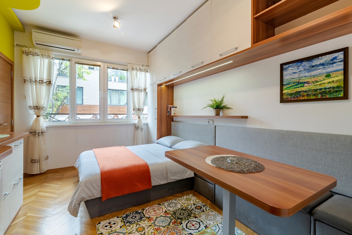 Elbűvölő és stílusos, új építésű stúdió egy régi épületben – Várna Center. Lépj be a kifinomultságba ezzel az elegáns, újonnan épült stúdióval, amely tökéletesen fészkel (3. emelet) egy elegáns, régi épületben Várna szívében. Ez a kiváló hely a tökéletes városi élményt kínálja - pár lépésre a festői Sea Gardentől, a gazdag történelmi helyszínektől, a homokos strandoktól, a múzeumoktól, a római fürdőktől, a nyüzsgő kikötőtől, valamint számos trendi bártól és étteremtől.