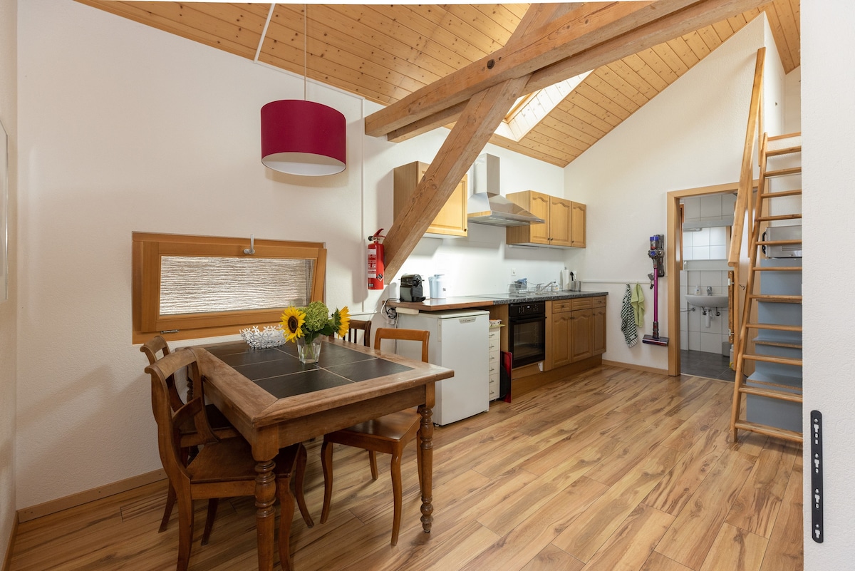 STÚDIÓ, 25m2 és mezzanine 10 m2 található a házunk előtt. Ez áll egy nagy szoba, konyha blokk, étkező asztal, kétszemélyes kanapé-ágy. Olasz zuhanyzó, wc, félemelet kétszemélyes ággyal. Ez a stúdió fel van szerelve : hajszárító, vasaló/vasalódeszka, hűtőszekrény, mikrohullámú sütő, sütő, vízforraló, Nespresso kávéfőző, kenyérpirító és TV-vel, Swisscom-Box és WiFi. Parkolóhely. Lehetőség a kerékpárok csökkentésére zárt térben.