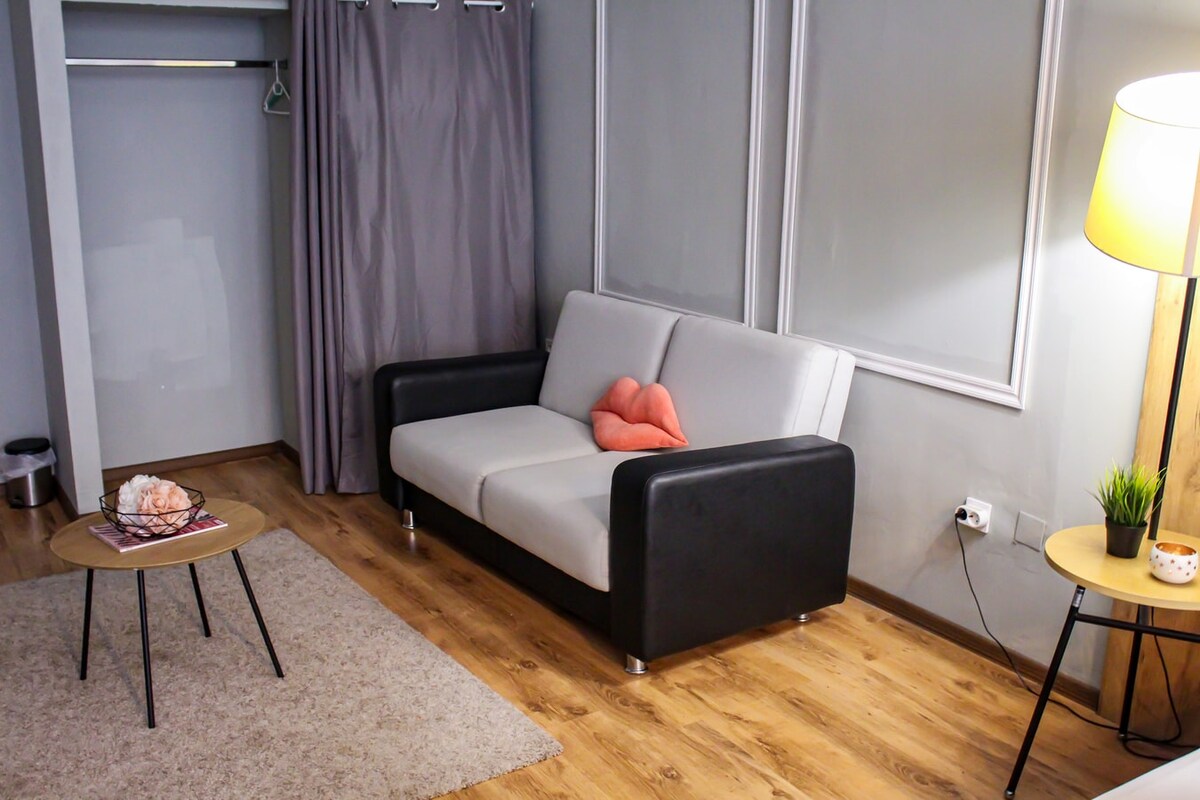 This room is furnished with big double bed, two nightstands with table lamps, a chest of drawers with a stylish mirror – all furniture is of ivory color and in unique unmatched boutique style. The room is also furnished with a recliner chair which can be unfold to accommodate two persons. Wide windows, behind whose curtains opens the view to Gurko Street. The house is equipped with luxury bathroom, a TV set with cable TV, a mini fridge, an air conditioner, a hairdryer and free wi-fi.