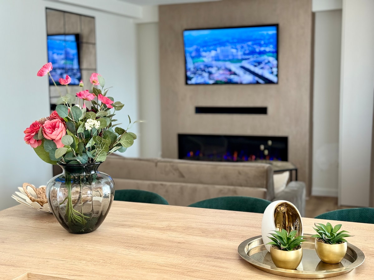 Apartamentul este compus dintr-un dormitor cu pat matrimonial și un living dotat cu canapea extensibilă. Oaspeții beneficiază de Smart TV cu Netflix inclus. Baia este echipată cu duș, iar bucătăria este complet utilată. În apartament veți mai găsi uscător de păr, fier de călcat și masă de călcat, precum și prosoape și lenjerie curate. De asemenea, sunt disponibile papuci de casă de unică folosință.. Apartamentul este situat la etajul 4 și este dotat cu aer condiționat.